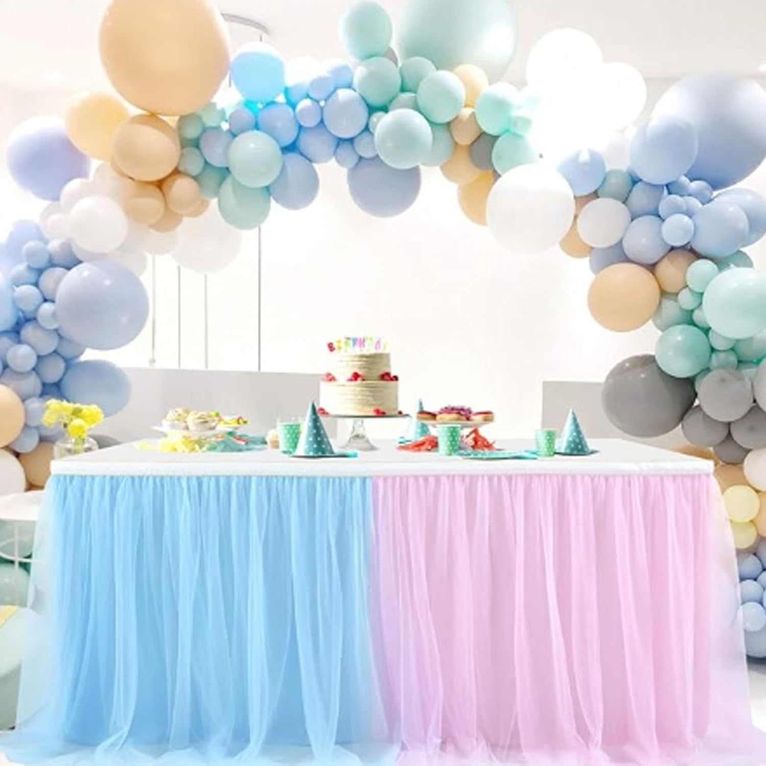 Transform your party setup with this elegant pink table skirt that blends softness, charm, and practicality in one. Designed to elevate the aesthetic of any table setting, it adds a graceful layer of texture and color that perfectly complements baby showers, birthdays, and weddings alike. The delicate tulle fabric flows effortlessly, creating a dreamy atmosphere whether you're decorating a dessert station, head table, or gift area. With its carefully crafted details and premium materials, this table skirt offers both visual appeal and dependable quality. It’s an effortless way to enhance your event décor with a polished, professional look that guests will remember.Product SpecificationsProduct Name: Tulle Table SkirtMaterial: MeshColor: Blue-PinkDimensions: 6ft (72 x 30 in), 9ft (108 x 30 in)