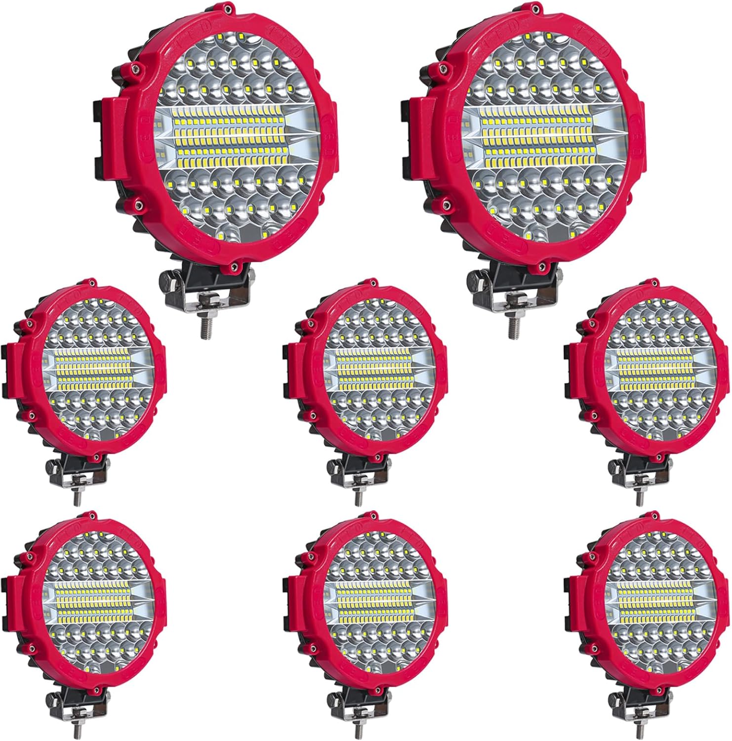 7 Inch Round LED Offroad Lights - 201W Round Led Light Bar. It is a spotlight design, but you can get a wider range of illumination by adjusting the throw angle to make it a floodlight. Widely compatible, fit for most 12V 24V vehicles. almost all 4x4, Polaris, 6x6, 4WD, Autos, Cars, Pickup, Trucks, SUVs, ATVs, Motorcycles, Boats, etc. Additionally, there are many indoor and outdoor uses: garden lighting, backyard lighting, backup light, off road lighting, reverse lights, construction lighting and more Specific: Size: 7.0 x 2.0 x 7.0 Inch MAX Power: 201W/PC (67x3W High Intensity LED) Color Temperature: 6000K( White Light ) Material:Die-Cast Aluminum Housing, PC Lens Opitonal Beam:Flood & Spot light Working Temperature: -40 to +105 Degrees Celsius Waterproof Rate:IP68.Waterproof, dustproof, quakeproof and anti-corrosive Operating Voltage: DC 9-30V DCfit all 12V/24V vehicles Working Life: 50,000 hours PACKAGE ITEMS: 4pc Round LED Offroad Lights 4pc Mounting Brackets and Screws