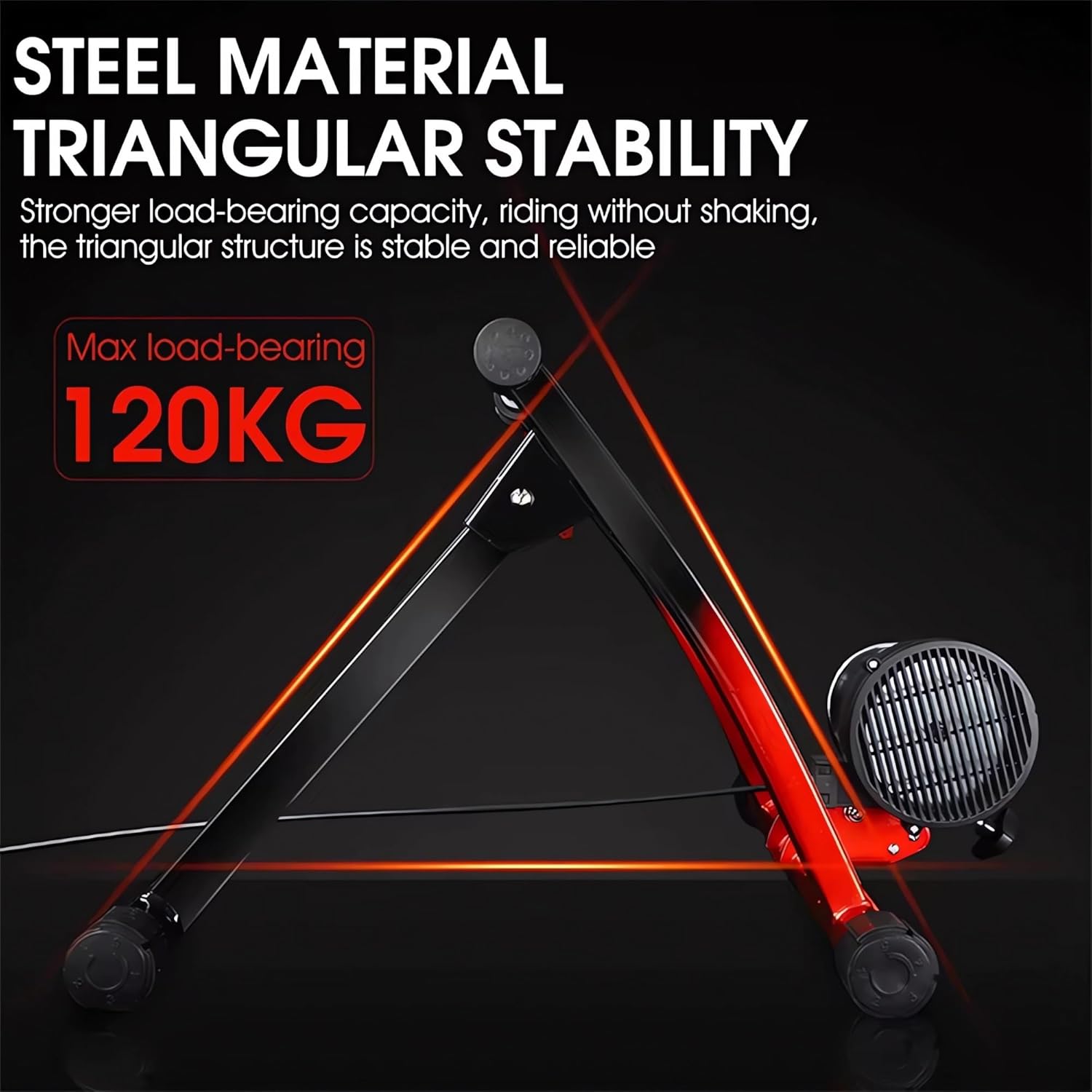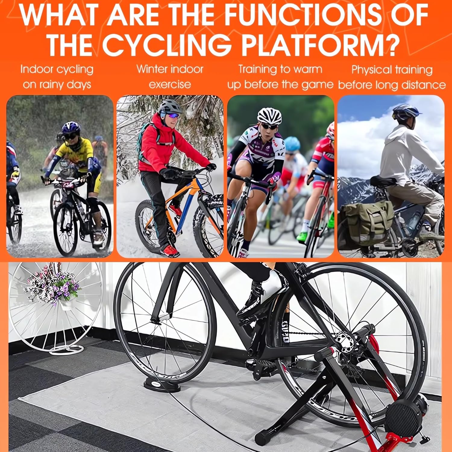 One of the problems with cycling, is that the cold and snowy winter conditions keeping you from enjoying the roads or trails. Maybe it is raining or is too windy outside, or perhaps you need to avoid rush hour traffic or an unsafe dusk ride. This is when you just mount your bike on to a bike trainer and get the exercise that you want, but at home. There is no reason why you can not exercise with your bike when the outside weather is bad.The front wide and rear narrow triangle sweat-proof net, the front end can catch most of the sweat dripping, and the rear end is narrowed without touching the legs. It can your frame and bottom bracket from the corrosion of heavy sweat, and helps to minimize the amount of cleaning after a hard workout.Specifications:Material: Steel, MagnetsAvailable for: 24-28" mountain bike, 700C road bikeProduct Name: Indoor Exercise Bike TrainerDesign and Style: Portable, Sturdy, CompactUsage and Purpose: Indoor Cycling, Maintenance, FitnessPerformance and Property: Magnetic Resistance, Noise-Reduction, Heat DissipationPackage Included:1 * Indoor Bike TrainerSmall ways to reduce noise:1. You can change to slick tires to reduce the noise of magnetic resistance friction.2. Put a yoga mat under the riding platform to reduce the contact between the riding platform and the ground, which can achieve the effect of reducing noise.Note:Due to the different monitor and light effect, the actual color of the item might be slightly different from the color showed on the pictures.Please allow 1-2cm measuring deviation due to manual measurement.