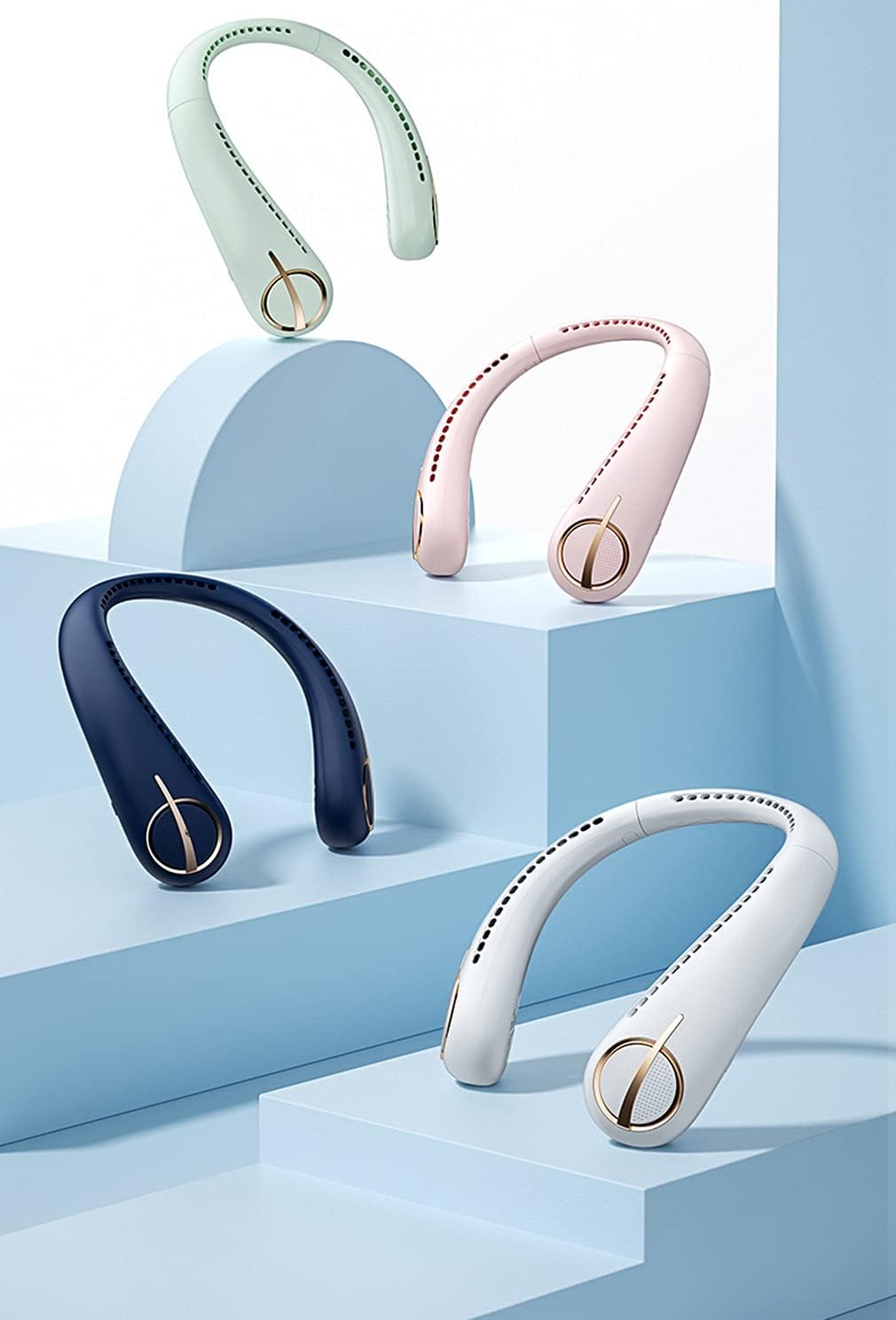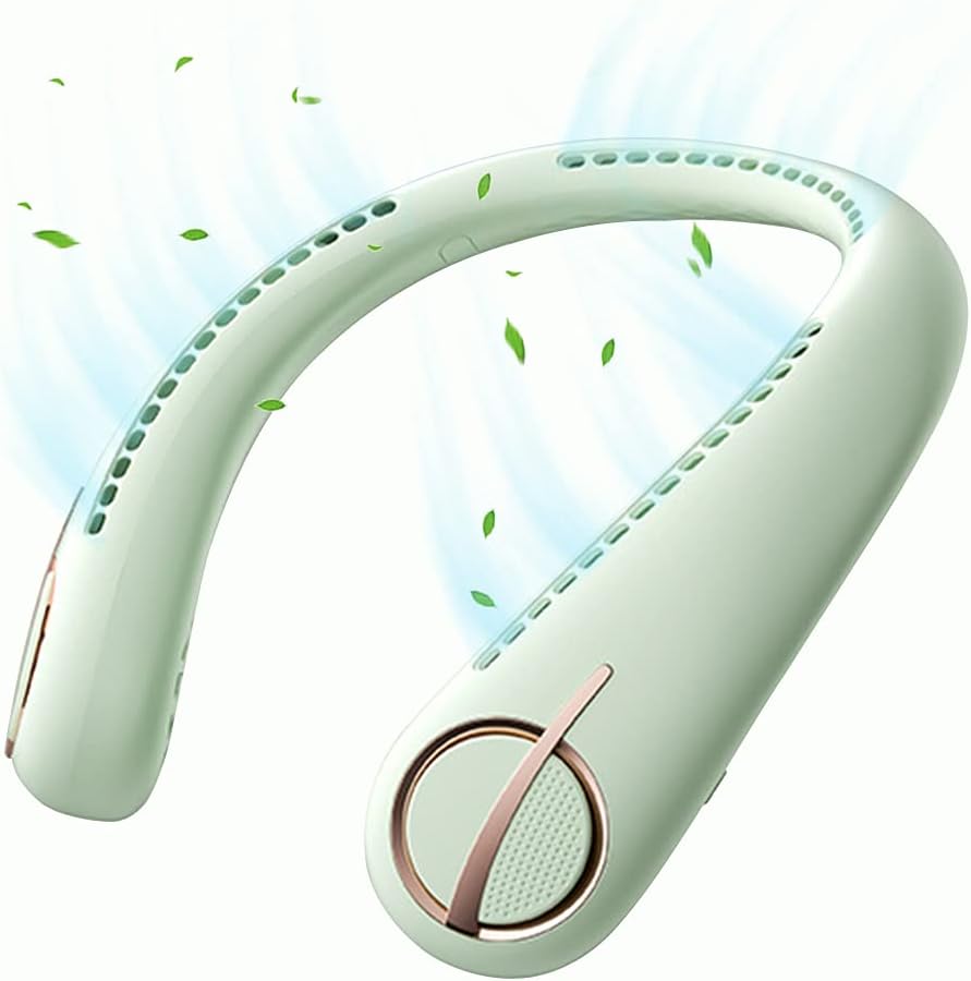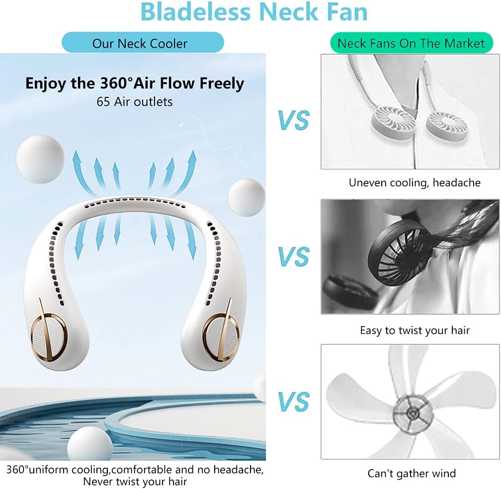 The hands-free neck fan is designed like a headphone, freeing your hands to enjoy the coolness anytime, anywhere. Best friend for work, office, sports, travel, hiking, cycling, etc.Why choose us?- The bladeless design will not entangle the hair, safe to use.- 65 air outlets and turbocharged fan blades that ensure smooth and powerful airflow to keep you cool.- 3 Speeds Adjustable: Low/Medium/High 3 wind speeds, meet your different needs.- With upgrade negative ion function, effectively purify the air, as if you're in the forest.- A best gift for your mom, dad, sisters, brothers, grandmas, grandpas, girlfriends, boyfriends, children and colleagues in the hot summer.Specification:- Material: ABS+PC- Product weight: 233 g- Battery Capacity: 1000mAh*2- Input Power: 5V/1A- Charging Interface: USB- Running Time: About 2-6 hours, depend on different speeds- Dimension: 204 x 194 x 93mmPackage List:- 1 x Portable Neck Fan- 1 x USB Charging Cable- 1 x User ManualWarm Tips: - Fill the battery before using the personal mini fan to ensure battery life. Charge the rechargeable fan when it cannot reach the 3rd speed or cannot be turned on.