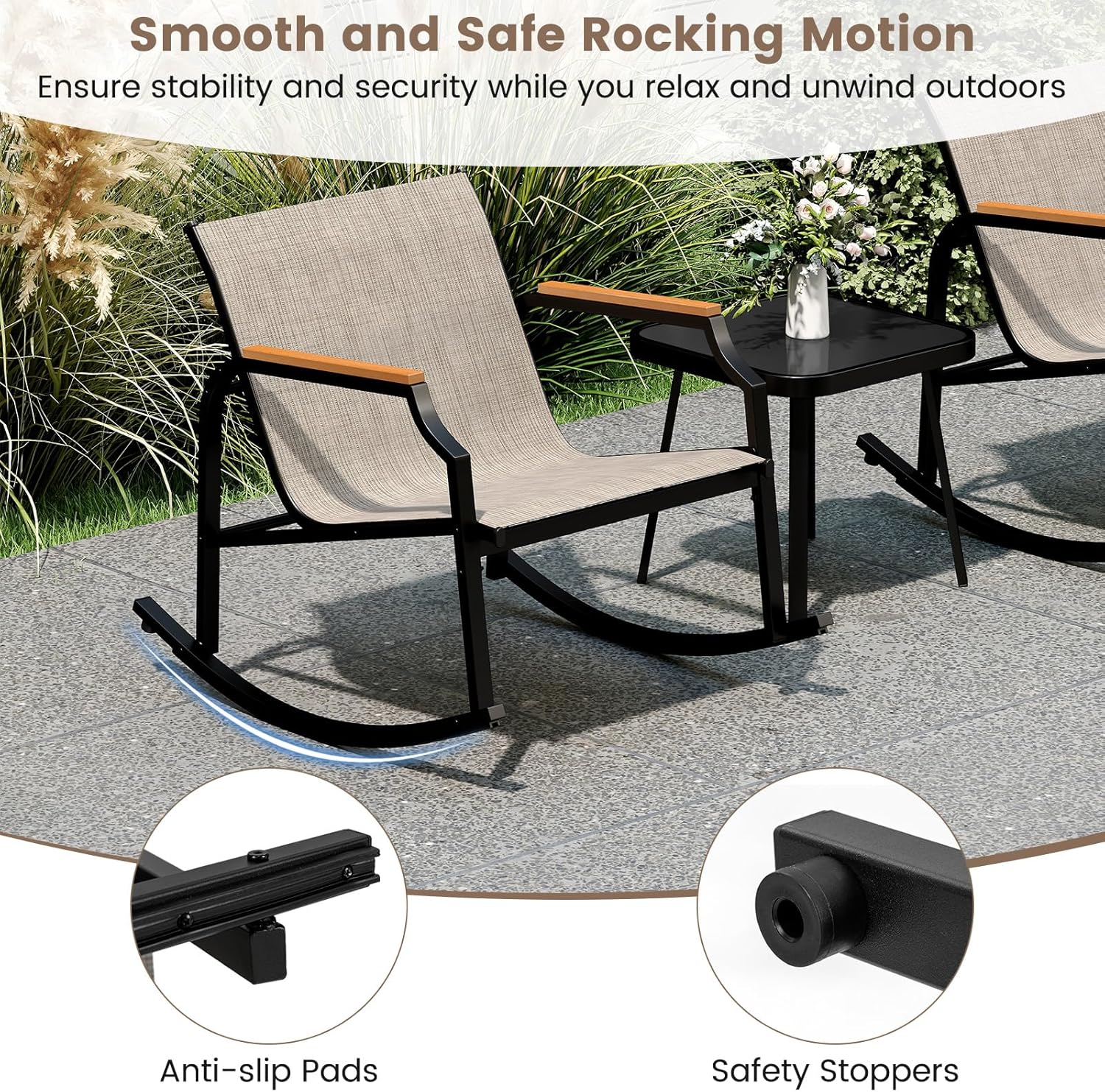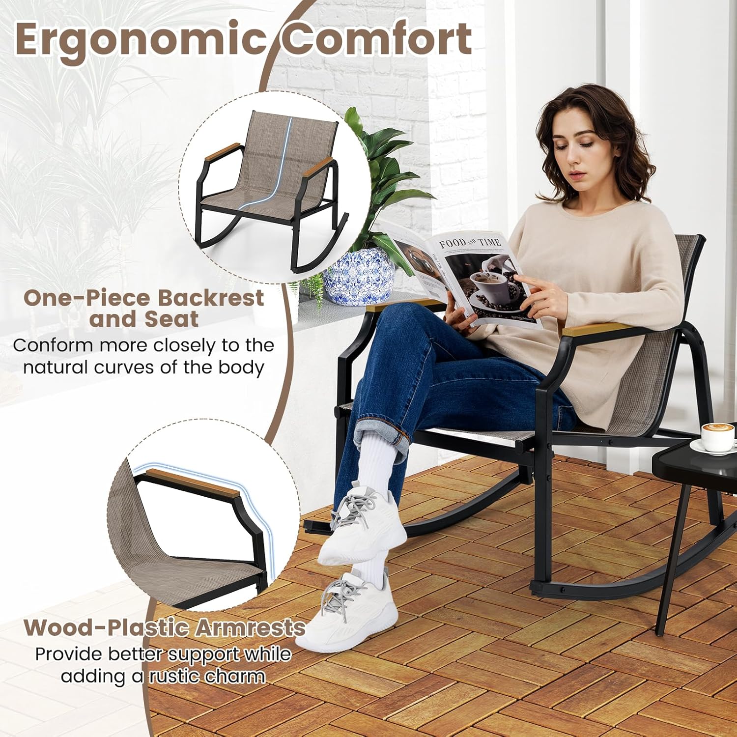 Description: Start with our sturdy, metal-framed rocking chairs, each holding up to 330 lbs and featuring ergonomic, breathable fabric seats along with comfortable wood-plastic armrests for unparalleled sitting pleasure. These porch chairs exhibit a soothing, safe rocking motion thanks to anti-slip pads and safety stoppers. This patio furniture set includes a matching square coffee table, its top crafted from high-quality tempered glass with gracefully rounded corners, adding both style and functionality to your relaxation space. Features: The rocking chairs offer a gentle, soothing motion for pure relaxation Anti-slip pads and safety stoppers ensure a secure rocking experience Each rocker is built with sturdy metal frame and reinforced crossbars They can hold up to 330 lbs per chair, providing long-lasting stability The high-quality fabric is quick-drying and wear-resistant It also makes you feel breathable for those summer days The ergonomic design features a one-piece backrest and seat Conform more closely to the natural curves of the body The wood-plastic armrests provide better support while adding a rustic charm Premium tempered glass tabletop for convenience and elegance Rounded corners on the table ensure safety around it Specifications: Color: Black + Brown Material: Metal, Fabric, Tempered Glass, Wood-Plastic Coffee Table: 17.5" x 17.5" x 16.5"/45 x 45 x 42 cm (L x W x H) Rocking Chair: 35" x 27" x 29"/89 x 69 x 74 cm (L x W x H) Seat Sizes: 22" x 18"/55 x 45 cm (W x D) Seat Height from the Ground: 16"/41 cm Total Net Weight: 44 lbs/20 kg Weight Capacity of Each Rocking Chair: 330 lbs/150 kg Weight Capacity of Coffee Table: 70 lbs/30 kg Package Includes: 2 x Patio Rocking Chairs 1 x Coffee Table 1 x Instruction