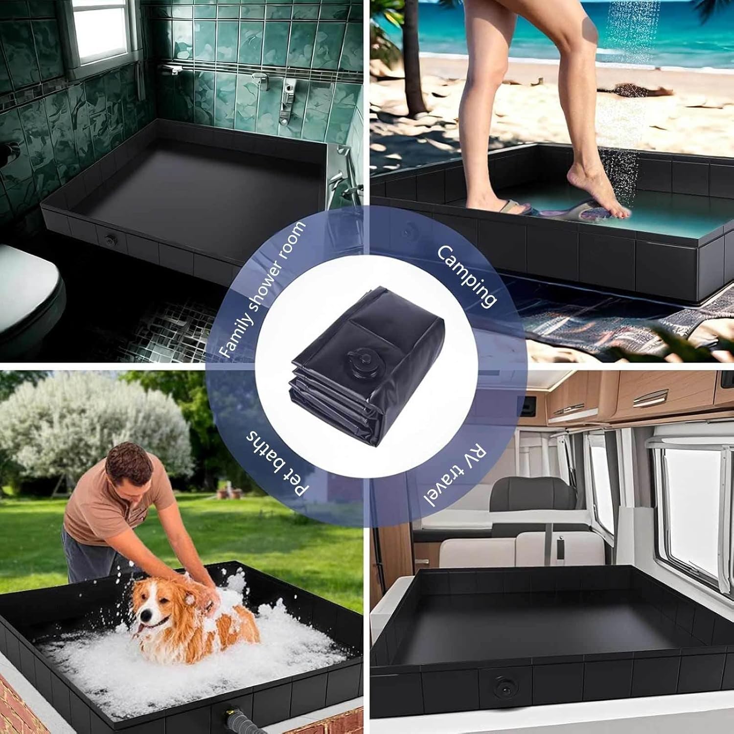 Portable Shower Pan—minimal space use! Lightweight, folds flat for RV/backpack storage. Quick assembly. Ideal for camping/travel. Anti-slip base prevents spills. Leak-proof design ensures stability. Effortlessly create secure showers anywhere with this compact essential.Name:Rv Shower PanColor:BlackMaterial:Environmentally friendly PVCProduct:Dimensions 41'' x 41'' x 5''/104cm x 104cm x 13cmShape:SquareItem Weight:3 Pounds/1.35 kgSpecial:Feature PortableStyle:ModernRecommended Uses:For Product Camping, Beach, OutdoorIncluded Components1×Rv Shower Pan1×1.2m Water Hose1×Screw Holder1×Storage Bag