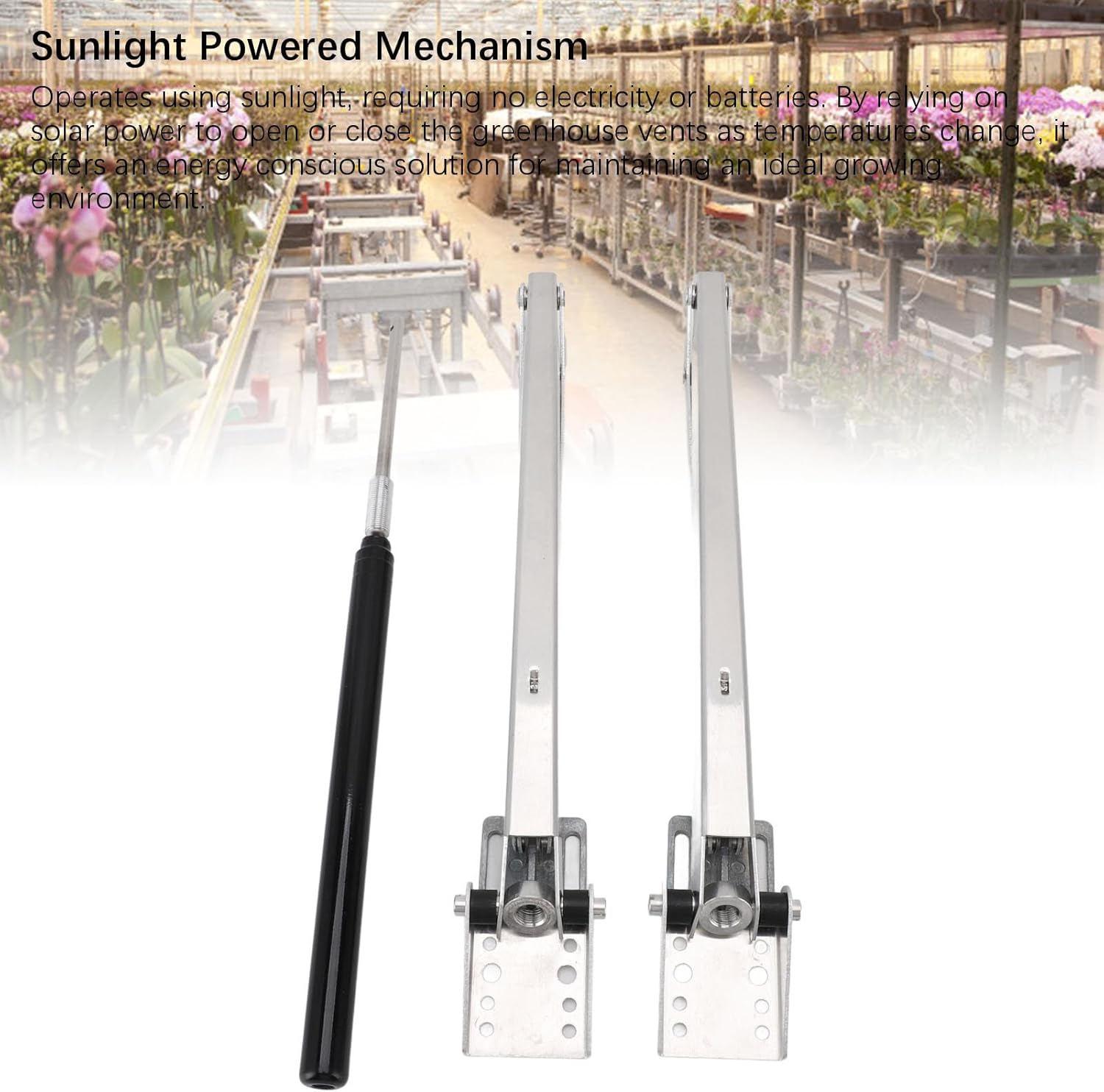 1. [ENERGY EFFICIENT] Operates using sunlight, no electricity needed. Maintains ideal growing temperature for plants. Prevents overheating. 2. [DURABLE ALUMINUM ALLOY] Crafted from strong material for long term use. Withstands daily operation. 3. [EASY INSTALLATION] Includes clamps and screws for effortless setup. Saves time and effort. 4. [AMPLE VENTILATION] Supports up to 15lb weight. Opens window up to 18" for optimal airflow into greenhouse. 5. [AUTOMATIC CONTROL] Ensures convenient ventilation by automatically opening and closing greenhouse window. Specification: Item Type: Greenhouse Vent Opener Material: Aluminum Alloy Weight: Approx. 654g / 23.1oz Cylinder Size: Approx. 33x20.8cm / 13.0x8.2in Stand Size: Approx. 31.5x27cm / 12.4x10.6in Opening Temperature: 30°C / 86°F Maximum Opening Weight: 7kg / 15lb Maximum Window Opening: 45cm / 18in How to Use: The cylinder and bracket are simply mounted to the desired window. PackageList: 2 x Cylinder 2 x Bracket 2 x Accessory Pack (16 x Screws, 8 x Accessories) 1 x Instruction Manual